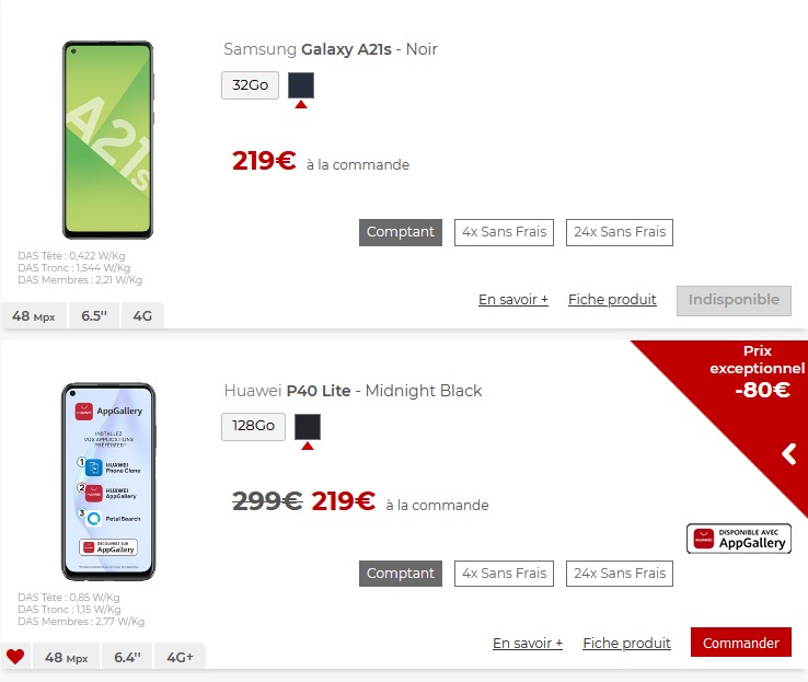 Aujourd’hui, nous opposons les Samsung Galaxy A21s et Huawei P40 Lite, tous deux proposés à 219 euros, grâce à une réduction de prix sur le second. Notez d’ailleurs qu’ils sont disponibles en plusieurs fois sans frais.