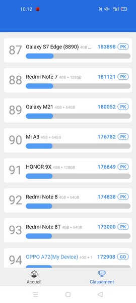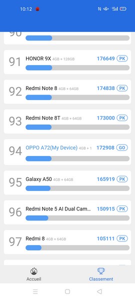 Dans les benchmarks, le smartphone chinois ne brille pas spécialement. Testé dans AnTuTu, il côtoie les Samsung Galaxy A50, Xiaomi Redmi Note 8 et Honor 9X. Disk Speed indique 231 Mo/s en écriture et 405 Mo/s en lecture pour la mémoire interne. Cette dernière peut d’ailleurs être étendue grâce à un emplacement MicroSD dédié. Vous n’aurez ainsi pas à choisir entre dual-SIM et extension mémoire du fait d’un slot hybride NanoSIM/MicroSD.