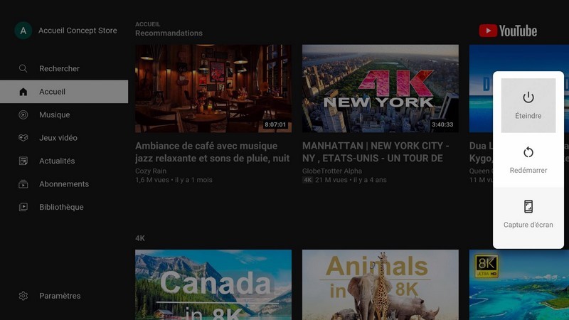 Concrètement, il suffit de garder le bouton On/Off de la télécommande appuyé pour faire apparaitre un petit menu depuis lequel on peut éteindre et redémarrer, mais également effectuer une capture d’écran. Comme cela se fait sur les smartphones et tablettes Android en fait.