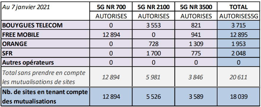 On l’attendait pour connaitre les évolution depuis le lancement de la 5G, l’observatoire vient d’être publié par l’ANFR. Il en ressort qu’au 7 janvier 2021, 18 039 sites 5G sont autorisés en métropole : 3 589 dans la bande 3,5 GHz ; 5 526 dans la bande 2100 MHz et 12 894 dans la bande 700 MHz.