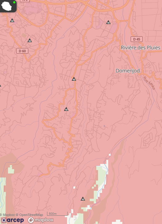 Carte de couverture 4G/4G+ de Free Réunion (donnée de monreseaumobile.fr) :