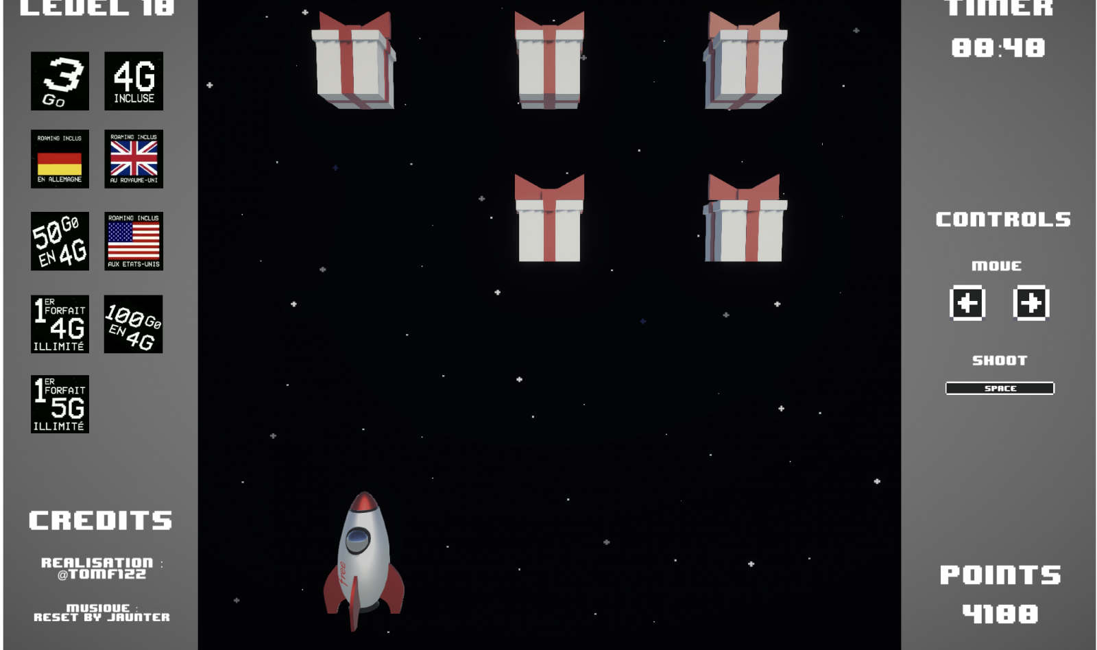 Sans prétention, ce shoot ’em up destiné aux employés de l’opérateur, a visiblement été très bien reçu, Xavier Niel l’a même terminé. A vous de shooter tous les enrichissements qu’a connu le forfait mobile Free au cours de son existence.Ce jeu a été réalisé par @tomf1zz , jeune 3D artiste bordelais et développeur.
