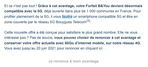 L’opérateur justifie cette hausse par l’usage croissant des données mobiles, mais a le mérite, contrairement à son concurrent Red by SFR, de proposer un bouton clairement visible permettant de refuser cette hausse. Dans ce cas précis, l’abonné dispose du droit, jusqu’au 20 juin 2021, de renoncer à son avantage.