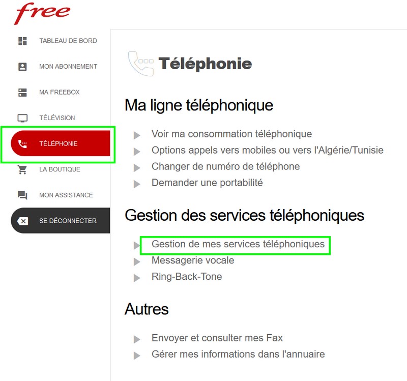 Une fois connecté à l’l’Espace Abonné, allez dans la rubrique “Téléphonie”, puis la sous-rubrique “Gestion de mes services téléphoniques”