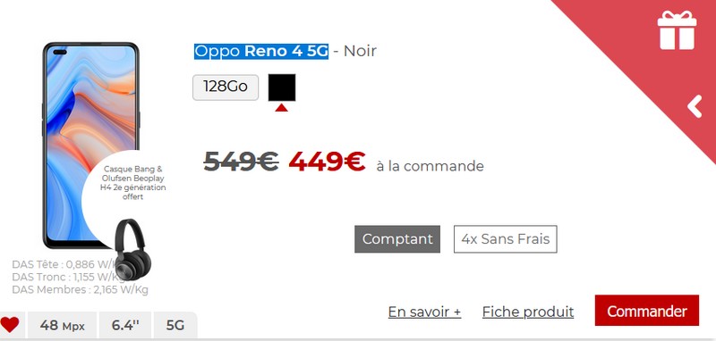 Ce smartphone, c’est le modèle Oppo Reno4 5G que nous avons eu l’occasion de tester et dont le prix baisse de 100 euros, passant ainsi de 549 et à 449 euros. Le paiement en 4 fois sans frais est possible, avec un versement de 113 euros à la commande, puis 3 versements de 112 euros. Notez au passage qu’un casque audio Bang & Olufsen Beoplay H4 2e génération d’une valeur de 300 est offert.
