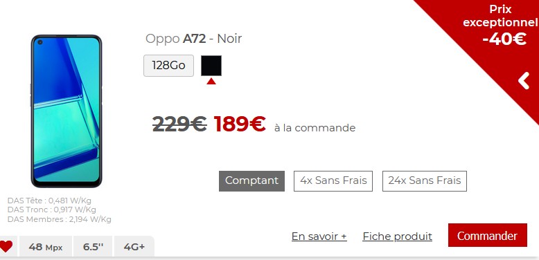 Le smartphone Oppo A72 profite en effet d’une remise de 40 euros, voyant ainsi son prix passer de 229 à 189 euros. On peut également l’acquérir en 4x sans frais (48 euros à la commande, puis 3 fois 47 euros) ou 24 fois sans frais (69 euros à la commande, puis 24 fois 5 euros).