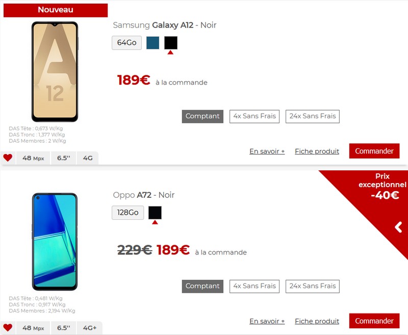 Aujourd’hui, nous opposons les Samsung Galaxy A12 et Oppo A72, tous deux affichés à 189 euros grâce à une récente baisse de prix sur le second. Notez d’ailleurs qu’ils sont disponibles en plusieurs fois sans frais.