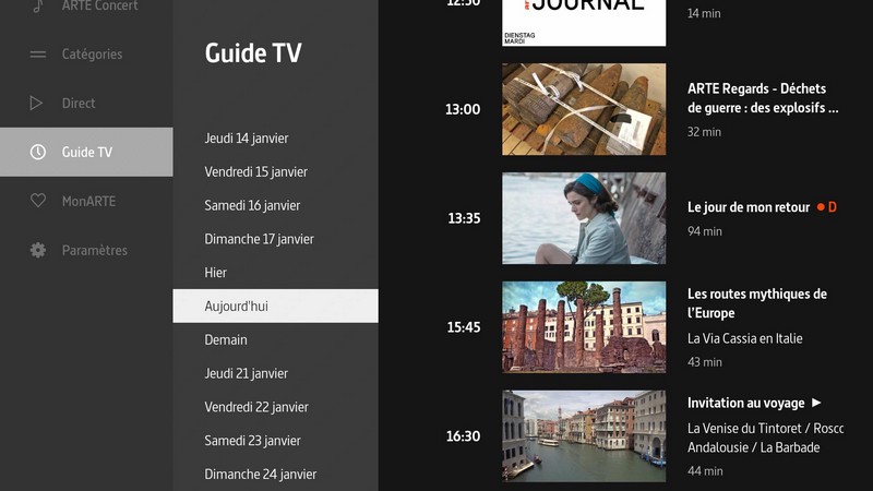Un bouton “Guide TV” donne accès à la programmation de la chaîne. L’écran se divise en deux parties, avec le choix du jour à gauche et la liste des contenus de la journée à droite.