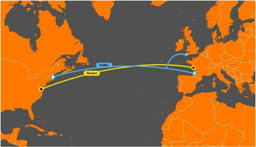 L’océan Atlantique est un des axes principaux le plus emprunté concernant la connectivité, avec 80 % du trafic Internet généré en France en provenance des Etats-Unis. Début de l’année 2020, Orange annonçait la mise en place du câble “Dunant” appartenant à Google. Doté de 12 paires de fibre, ce câble offre une capacité de connexion allant jusqu’à 30 Tbit/s chacune. Soit une capacité trois fois supérieur a l’ancienne génération de câble sous-marin.
