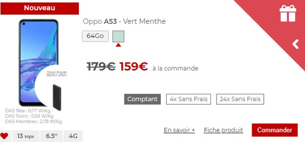 L’Oppo A53 s’affiche en effet à 159 euros au lieu de 179 euros. Il est également disponible en 4x sans frais (42 euros à la commande et 3 fois 39 euros) ou 24x sans frais (39 euros à la commande et 24 fois 5 euros).