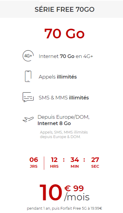 Le forfait intermédiaire de Free Mobile repasse la barre des 10€. L’opérateur propose durant une semaine une offre avec 70 Go de data en France métropolitaine, au prix 10,99€ pendant 1an.