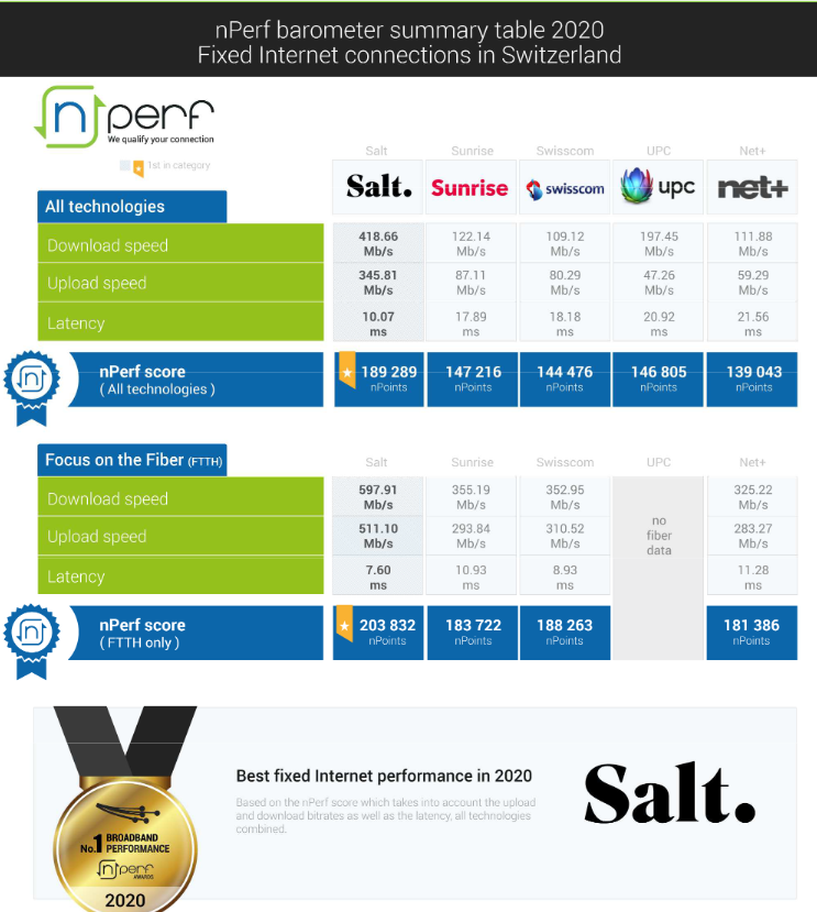 Nperf a publié aujourd’hui son baromètre annuel des connexions internet fixe en Suisse et Salt continue d’occuper la première place du classement pour l’année 2020.