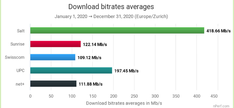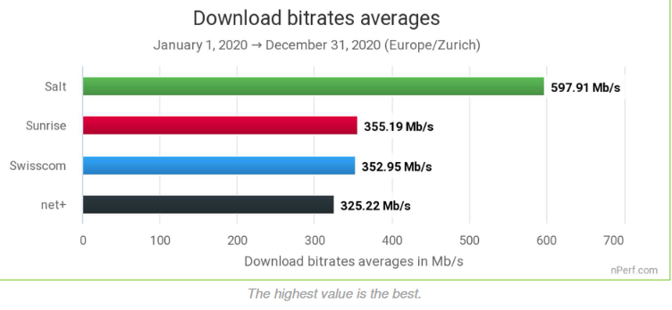 Le débit descendant moyen en Suisse en 2020 était de 157 Mb/s, un pallier très largement franchi par Salt qui pour sa part atteint les 418.66 Mb/s toutes technologies confondues, très loin devant tous ses concurrents.