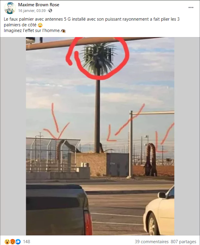 C’est une photo, issue d’une vidéo aux 330 000 vues, qui a beaucoup tourné sur les réseau sociaux ces dernières semaines où l’on peut voir des palmiers complètement pliés autour d’une antenne mobile cachée dans un faux palmier. Il n’en fallait pas plus aux complotistes pour en tirer une conclusion hâtive : “c’est une antenne 5G avec son puissant rayonnement qui a fait plier les 3 palmiers à côté”.