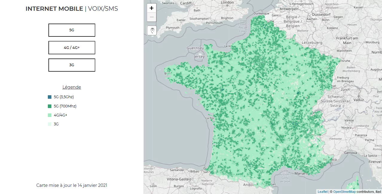 Une carte interactive qui se met à la page. Les données de couverture 3G/4G/5G ont été mises à jour sur le site de Free Mobile, pour indiquer plus précisément la disponibilité des différentes technologies. Ainsi, vous pouvez dorénavant retrouver l’état de la couverture de Free au 14 janvier dernier, contre le 15 décembre auparavant, date de lancement de son réseau 5G.