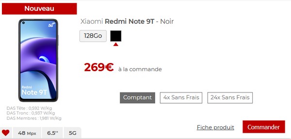 Ce smartphone, c’est le Xiaomi Redmi Note 9T que l’opérateur propose uniquement dans sa configuration avec 128 Go de stockage et dans un coloris noir pour 269 euros. Il est également possible de l’acquérir en 4x sans frais (68 euros à la commande, puis trois fois 67 euros) ou 24x sans frais (77 euros à la commande, puis vingt-quatre fois 8 euros).