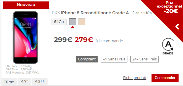 La première promo concerne l’iPhone 8 reconditionné 64Go Grade A. qui est désormais proposé à 279€ au lieu de 299€ au tarif normal, soit 20€ de remise. Cette promo s’applique également au paiement en plusieurs fois sans frais : 4 fois sans frais : 72€ à la commande puis trois fois 69€ ou en 24 mensualité : 87€ à la commande puis 8€ durant 24 mois.