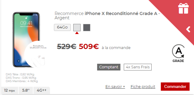 La deuxième promo concerne l’iPhone X reconditionné 64Go Grade A. qui est désormais proposé à 509€ au lieu de 529€ au tarif normal, soit 20€ de remise. Cette promo s’applique également au paiement en plusieurs fois sans frais : 4 fois sans frais : 128€ à la commande puis trois fois 127€ .