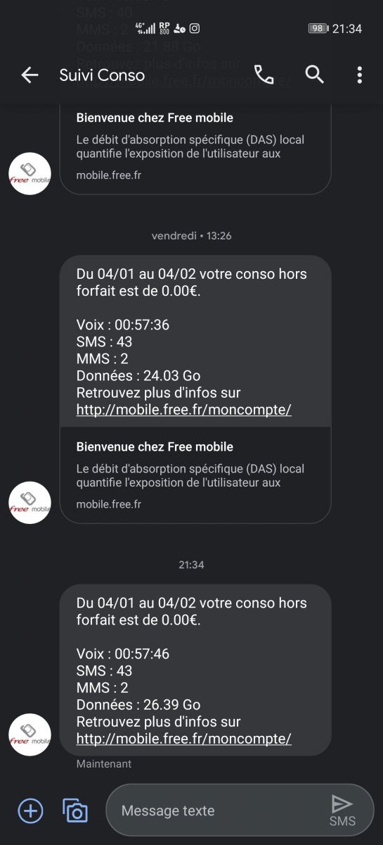 Appels, SMS, MMS et data, pour consulter son suivi conso, plusieurs possibilités s’offrent aux abonnés Free Mobile comme par exemple leur espace abonné ou encore l’application mobile officielle Messagerie vocale Free Réunion. Plus simple encore, il suffit d’appeler ou d’envoyer un SMS au 555. Si vous appeler le 555 vous entendrez alors un message vocal automatique : « Bonjour. Votre suivi de consommation vient de vous êtes envoyé par SMS. Bonne journée ».
