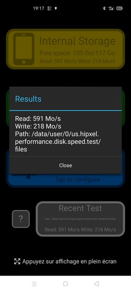 Côté benchmarks, Disk Speed indique 218 Mo/s en écriture et 591 Mo/s en écriture pour la mémoire interne. Un bug dans AnTuTu persistant, malgré plusieurs réinstallations de l’application, nous empêchait d’accéder à la partie classement.