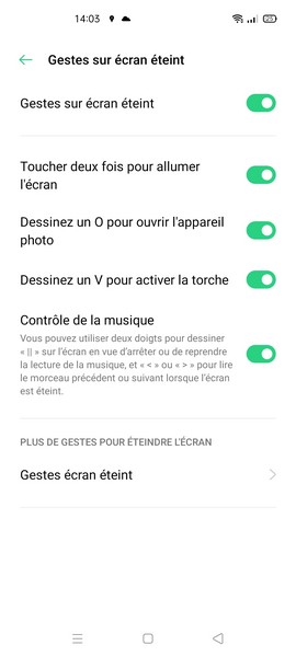 Les gestes sur l’écran éteint (V pour la lampe torche, O pour l’appareil photo)
