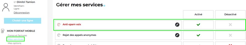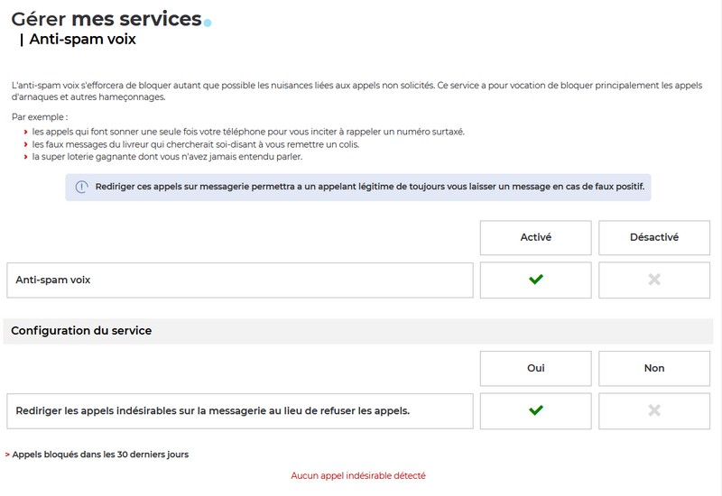 Pour cela, il suffit d’activer l’anti-spam voix proposé par l’opérateur. Cela se passe dans l’Espace Abonné, et plus précisément dans la rubrique “Mes services”. Il suffit alors de cliquer sur la case d’activation du service “Anti-spam voix”.