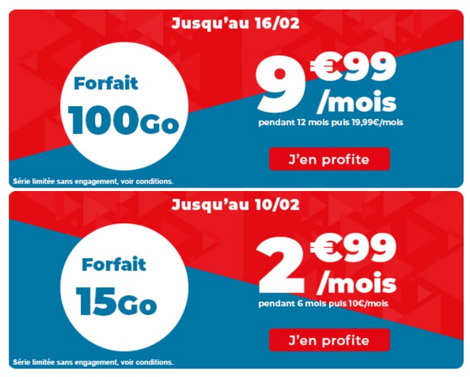 Dans le premier cas, le tarif vaut pour 6 mois, avant de passer à 10 euros, et l’offre est valable jusqu’au 10 février 2021. Dans le second, le prix passe à 19,99 euros après 12 mois et la promotion vaut jusqu’au 16 février 2021. Notez enfin qu’il faudra prévoir 10 euros pour la carte SIM triple découpe, avec un paiement au moment de la commande.