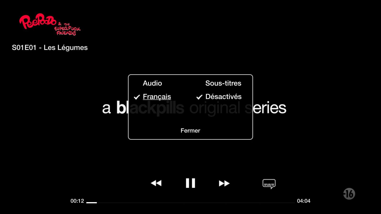 Retour donc au fameux écran d’accueil. L’identité graphique de Blackpills est très marquée, la faisant détonner avec d’autres services de SVOD en utilisant majoritairement du blanc, du jaune et du noir. D’ailleurs, cette charte graphique peut surprendre, puisque toutes les vignettes sont en noir et blanc, même celles de shows colorés comme Peepoodoo.Nous laissons cette direction artistique à votre appréciation. Pour notre part, nous la trouvons plutôt difficile à lire.