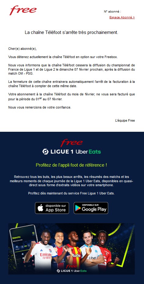 Dans sa missive, Free rappelle l’existence de son service Free Ligue 1 Uber Eats dont la gratuité a récemment été indiquée jusqu’à la fin de la saison. Le service est proposé sur smartphone via des applications Android/iOS, mais également sur Freebox.