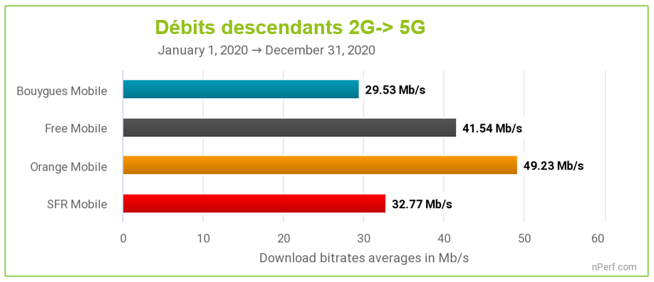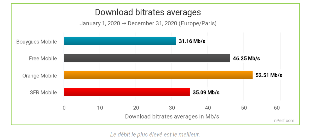 L’opérateur de Xavier Niel était déjà parvenu à se hisser sur la deuxième marche du podium derrière l’opérateur historique en 2019 et y reste en 2020. C’est notamment sur les débits descendants que Free se démarque de ses autres concurrents, proposant un débit moyen en 4G de 46.25 Mb/s, contre 52.51 Mb/s pour Orange. Bouygues et SFR sont loin derrière sur ce point, avec respectivement un débit de 31.16 Mb/s et 35.09 Mb/s .