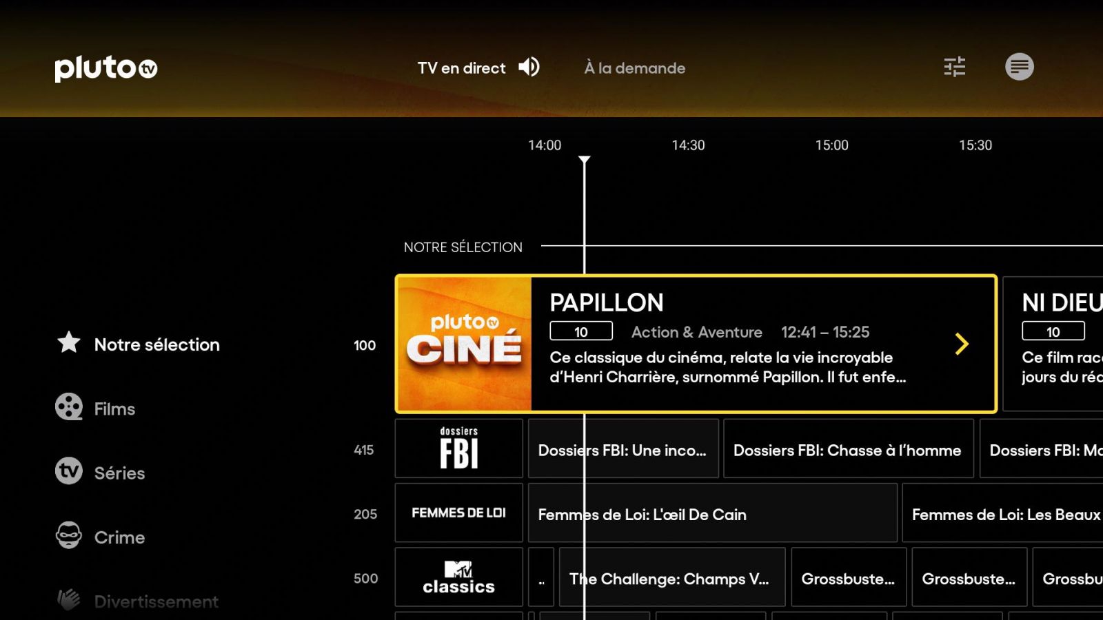 Le principe est simple : faite défiler vers le bas jusqu’à trouver un programme qui vous plaît dans les différents genres de contenus proposés. Vous basculez d’une chaîne à une autre, avec l’avancée du programme au moment où vous prendrez le direct indiqué par une ligne verticale coupant votre épisode/film au début, au milieu ou à la fin selon l’heure de visionnage. A noter, pour naviguer plus rapidement dans les catégories, il suffit de cliquer sur la flèche gauche de votre télécommande et de naviguer parmi la liste : films, séries, crime, divertissement etc.