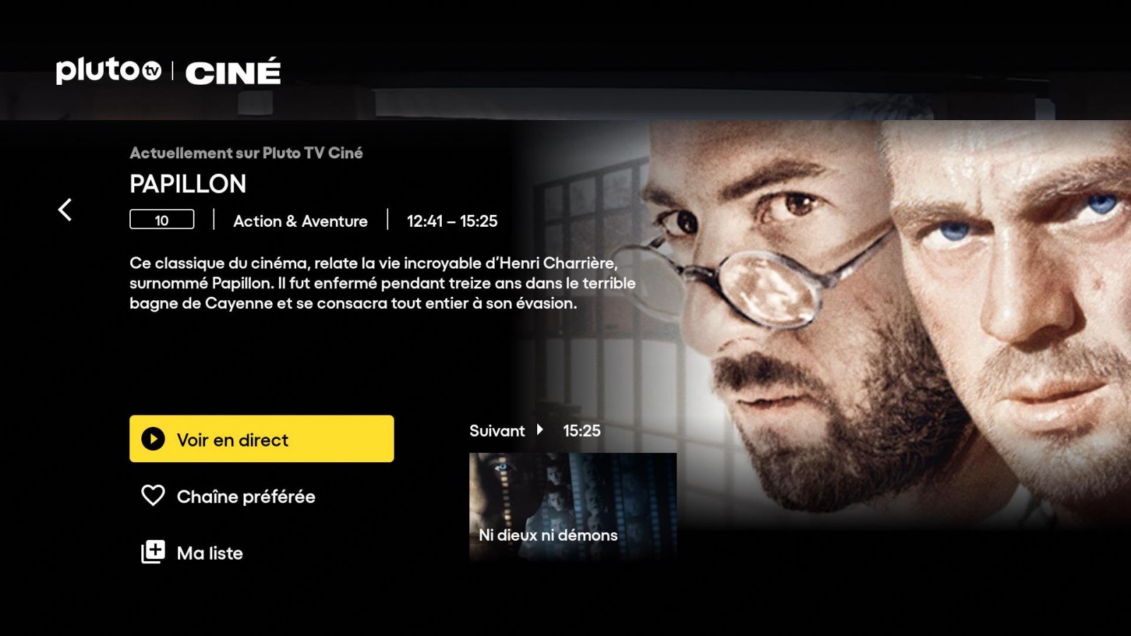 Un film vous a tapé dans l’oeil ? D’un simple appui sur la flèche droite de votre télécommande, vous pouvez accéder à sa fiche dédiée. Vous y retrouvez alors les informations habituelles : genre, durée et synopsis. Vous pouvez d’ailleurs l’ajouter à votre liste de lecture que vous retrouverez dans la section “à la demande”, et ajouter la chaîne à votre liste de chaînes favorites, qui rejoindra alors les diverses thématiques présentes sur l’écran d’accueil.