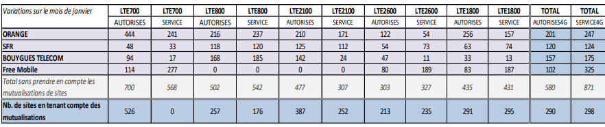 A cette date, 52 538 sites 4G sont autorisés en métropole, dont 47 796 sont en service. Les autorisations et les mises en service de sites 4G ont poursuivi leur progression sur le mois de janvier :
