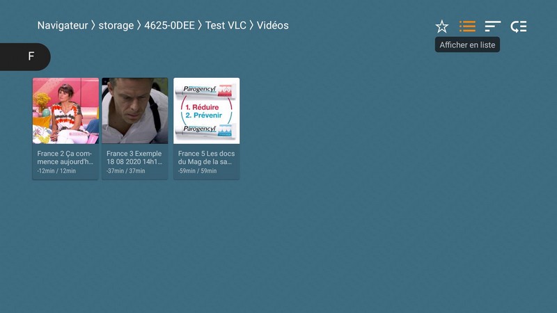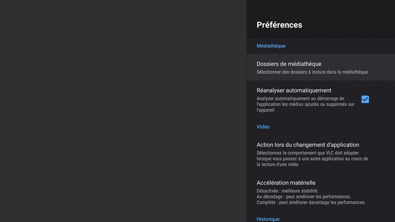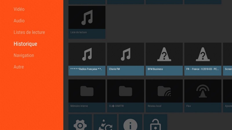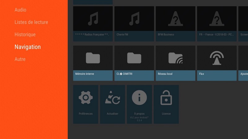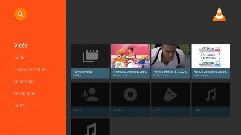 En dessous, des raccourcis pour accéder aux fichiers vidéo et audio, aux listes de lecture, à l’historique de lecture et à la navigation dans les médias.