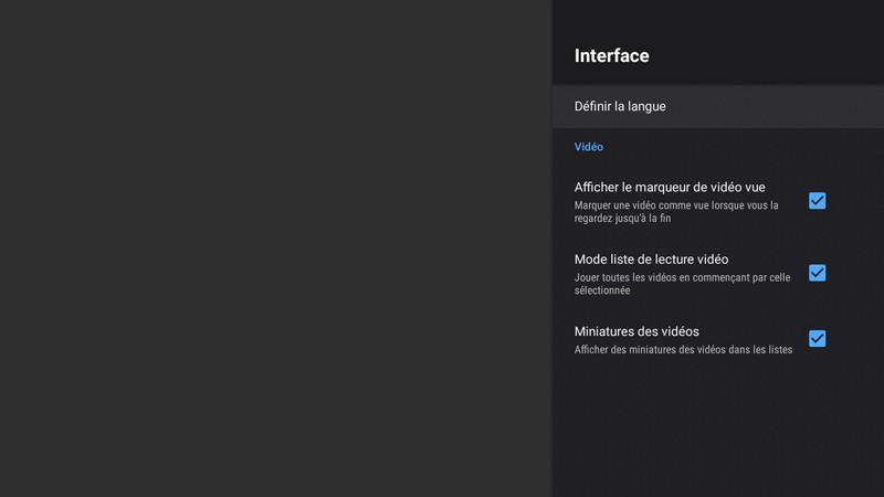 Parmi les nombreux paramètres, et plus précisément ceux dans la sous-section Préférences, il y a la possibilité de relancer l’analyse des médias à chaque lancement de l’application, d’activer l’accélération matérielle pour améliorer les performances, de désactiver l’historique de lecture, de supprimer l’historique de lecture, de charger automatiquement les sous-titres ou encore de régler la langue de l’application. Le bouton Actualiser permet de relancer l’analyse des médias pour détecter les contenus disponibles.