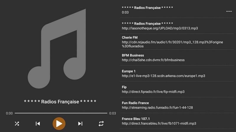 La section Listes nous permettait d’ouvrir un fichier .XSPF donnant accès à une liste de stations de radio téléchargée et transférée sur notre clé USB.