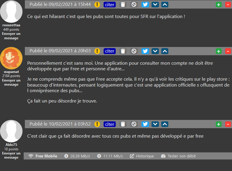 Il existe une application mobile pour gérer les informations de son compte Free Mobile, assez souvent mise à jour depuis quelques semaines. Bien pratique, certes, mais certains s’étonnent qu’elle ne soit pas directement développée par l’opérateur. En effet, il s’agit d’une appli autorisée par Free, mais développée en indépendant. Et donc supportée par la pub, ce qui peut déplaire à certains Freenautes. Le message est clair : une app développée directement par Free et sans pub est assez attendue !
