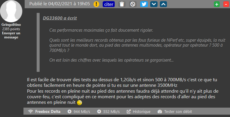 Les opérateurs indiquent dorénavant plus ou moins précisément les débits max atteignables sur leur réseau 5G. Si Orange et SFR font miroiter d’atteindre déjà le 2Gbit/s, certains sont tout de même très sceptiques. En effet, pour atteindre ces débits très élevés, il faut remplir un certain nombre de contraintes (proximité de l’antenne, agrégation de fréquences supportées sur le smartphone…). Et donc, DG33600 n’est pas encore impressionné par les speedtests remontant sur le net. Mais Gringolitino vient apporter une touche d’optimisme !