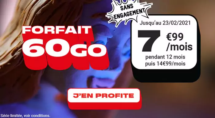 Jusqu’au 23 février, NRJ Mobile propose un forfait 60 Go (débit réduit au-delà) sans engagement à 7,99 euros par mois au lieu de 14,99 euros. Celui-ci intègre par ailleurs les appels, SMS et MMS en illimité, ainsi que 5 Go de data en roaming depuis l’Europe et les DOM. Le tarif promotionnel vaut durant la première année. Notez enfin que la carte SIM triple découpe, payable à la commande, coûte 10 euros.