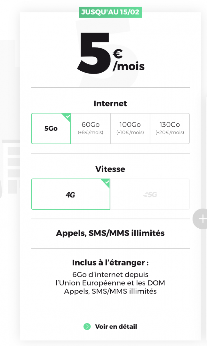 “Envie d’un prix mini, c’est ici“, Red by SFR propose jusqu’au 15 février un forfait 5 Go à 5€, sympa pour les petits budgets et les utilisateurs peu gourmands en data. Mais à y regarder de plus près, cette offre s’avère plutôt originale. C’est assez rare pour le noter, l’enveloppe de data incluse à l’étranger est plus conséquente que celle allouée en France métropolitaine, à savoir 6 Go. Pas vraiment idéal à l’heure où les voyages dans l’UE sont limités, crise sanitaire oblige.
