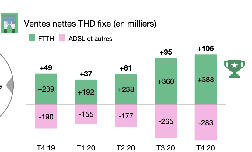 Autre évolution et pas des moindres, 22,9 millions de foyers français sont désormais éligibles à une offre fibre de l’opérateur en France. “Ce sont 6,5 millions de foyers supplémentaires qui ont été rendus raccordables pendant l’année 2020. C’est une performance inédite, et une prouesse compte tenu du contexte”, se félicite ce matin son PDG Stéphane Richard.
