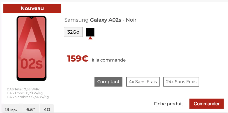 Interessant pour les petits budgets, celui-ci est désormais proposé dan la boutique en ligne de Free Mobile au prix comptant de 159€. Le paiement en 4 fois sans frais est aussi proposé soit 42€ à la commande puis 3 fois 39€. S’agissant du 24 fois sans frais, il faudra débourser 39€ à la commande puis 24 fois 5€.