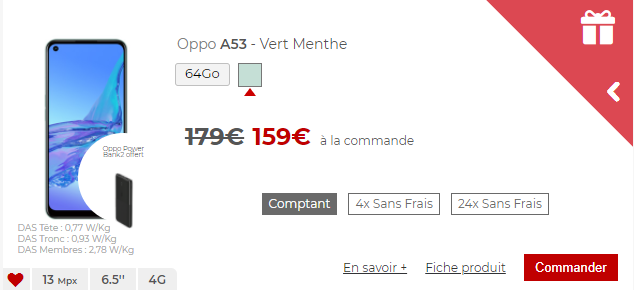 L’Oppo A53 s’affiche à 159 euros, au lieu de 179 euros, après une remise de 20 euros. Free propose également un paiement en 4x sans frais (42 euros à la commande, puis 3 fois 39 euros) ou 24 fois sans frais (39 euros à la commande, puis 24 fois 5 euros). par ailleurs, en plus de cette remise, une batterie externe OPPO Power Bank2 vous sera offerte sur demande.