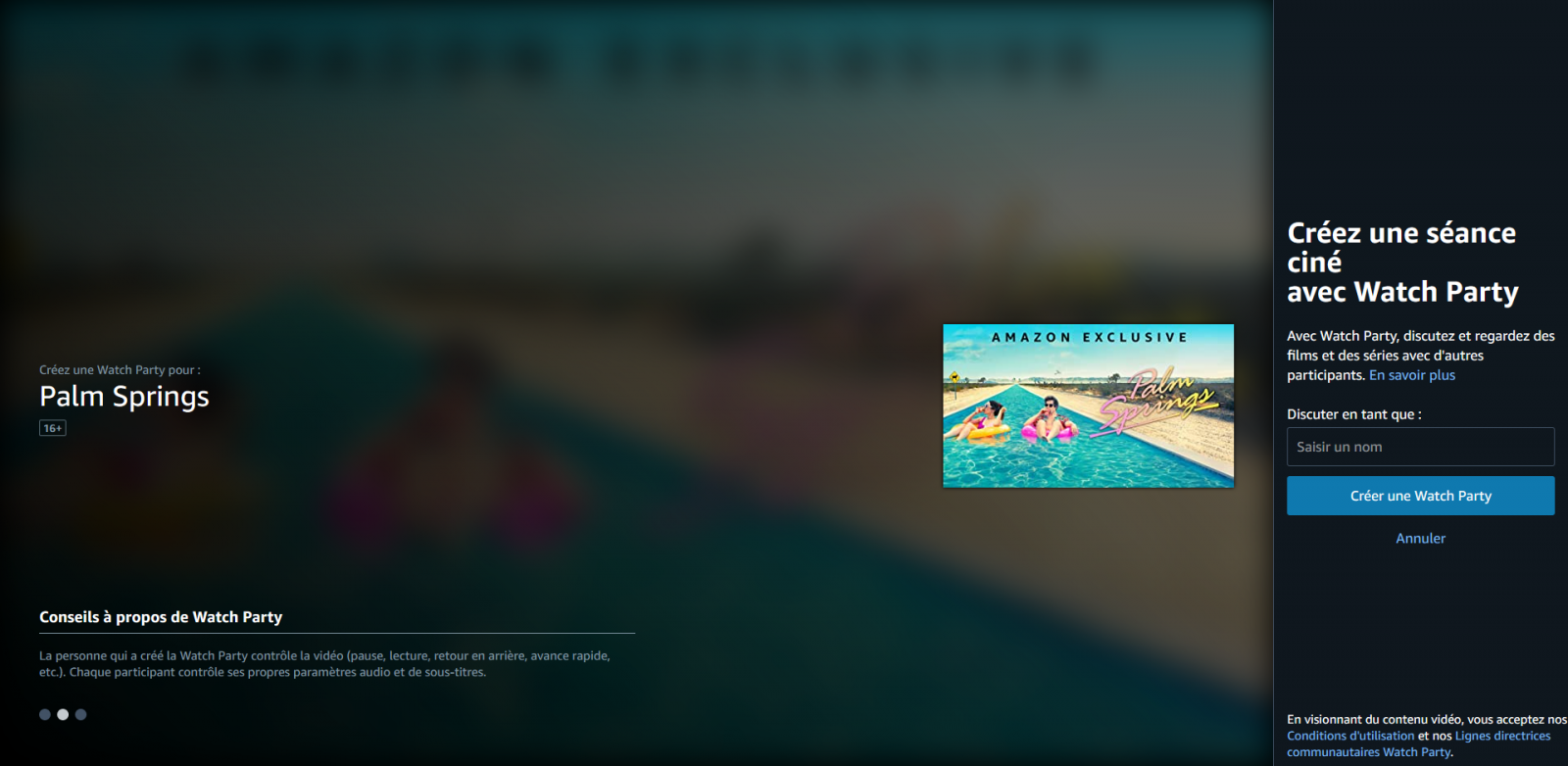 A l’instar de Disney+, Amazon Prime Video propose de lancer des Watch party, pour faire vos soirées cinéma avec vos amis à l’abri chez vous, malgré le couvre feu.