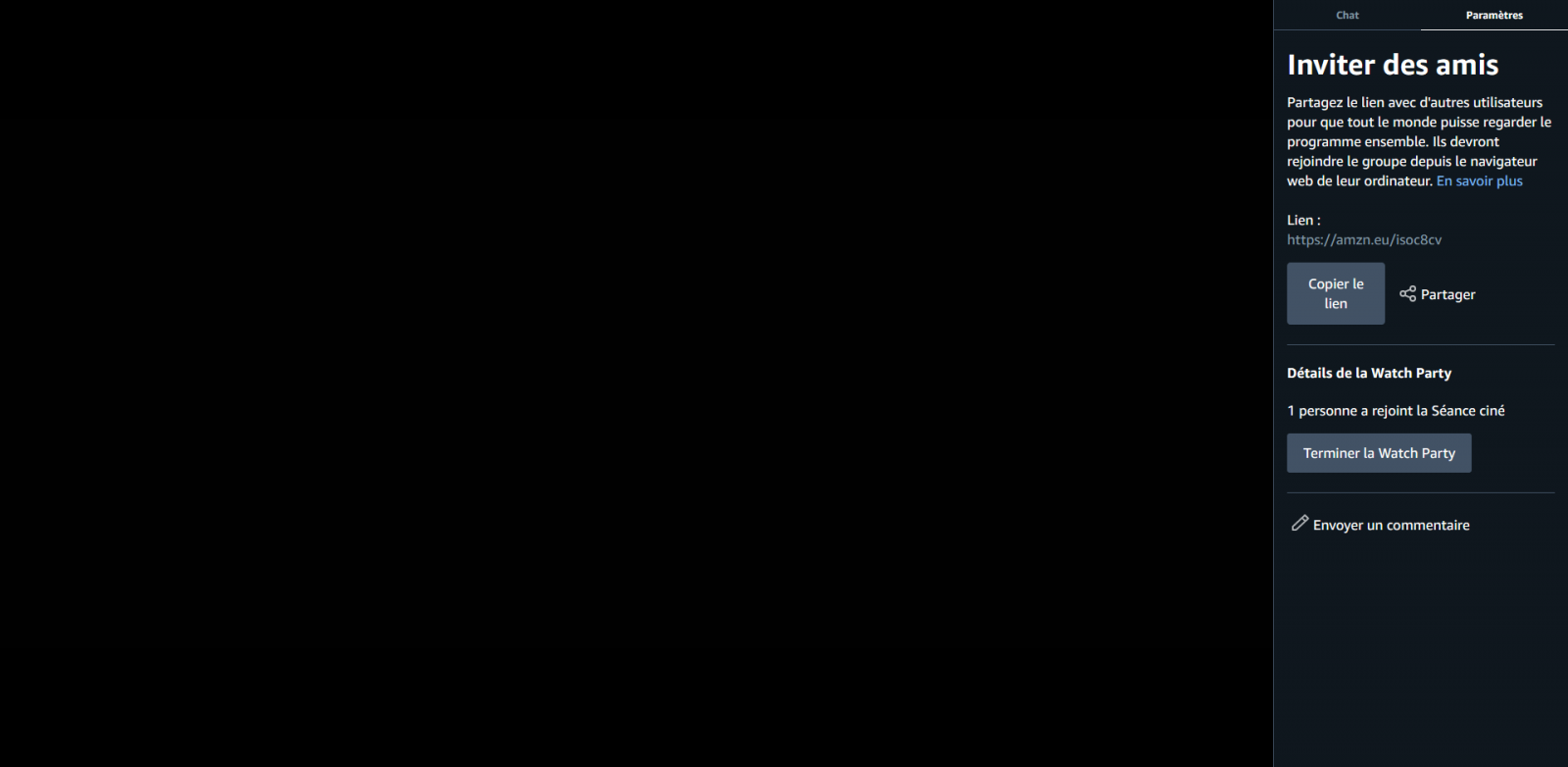 L’invitation se fait sous forme de lien généré automatiquement, à envoyer à vos proches pour qu’ils rejoignent votre séance. A noter, les invités pourront également envoyer leur propre lien à leurs amis une fois la Watch Party rejointe, on comprend mieux la capacité énorme de cette fonctionnalité, si chaque ami décide d’en inviter un autre…