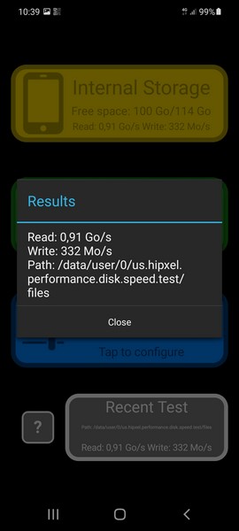 Ci-dessous, la mesure de la vitesse de la mémoire interne avec l’outil Disk Speed, qui indique 0,91 Go/s en lecture :