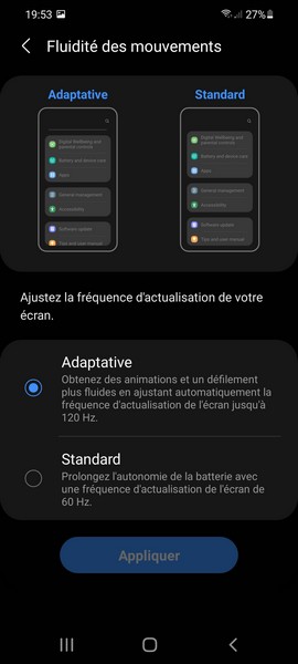 Depuis les paramètres, on peut choisir la chaleur d’affichage et choisir entre un taux de rafraîchissement standard (60 Hz) ou adaptatif (jusqu’à 120 Hz). Une fonction Protection du confort visuel permet de limiter la lumière bleue lors de l’utilisation le soir.