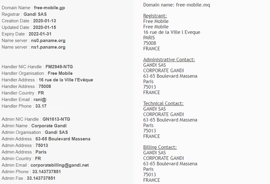 L’opérateur a réservé les noms de domaines free-mobile.gp pour la Guadeloupe et free-mobile.mq pour La Martinique. Ces derniers ont été enregistrés en 2020 par Free Mobile auprès de Gandi SAS.