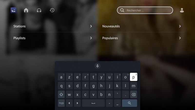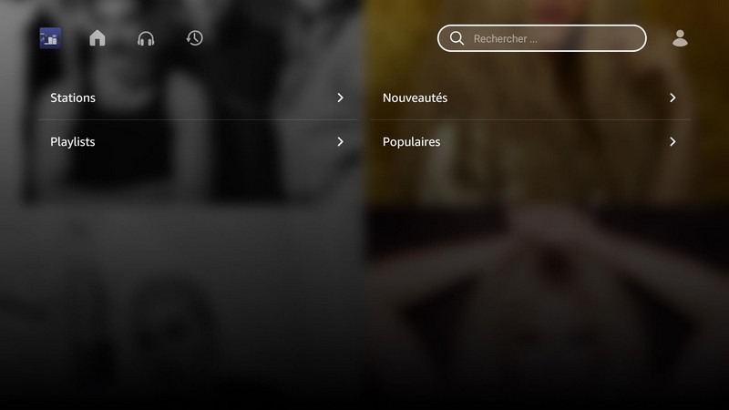 Un passage sur le moteur de recherche affiche des filtres “Stations”, “Playlists”, “Nouveautés” et “Populaires, lesquels donnent ensuite accès à des pages de recommandations de contenus.