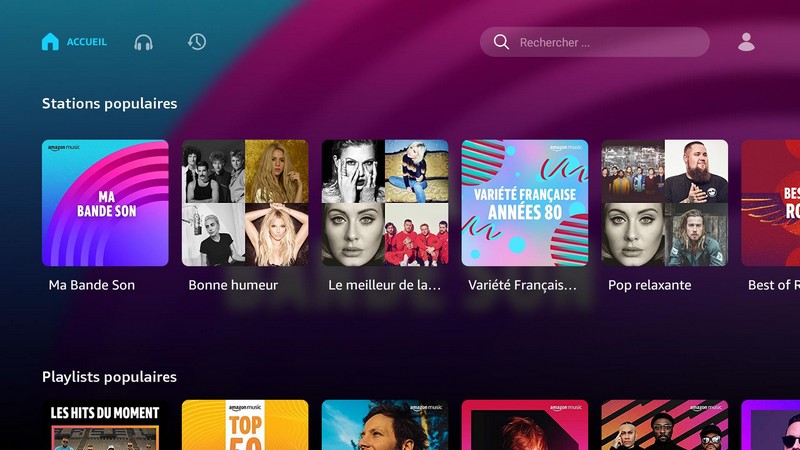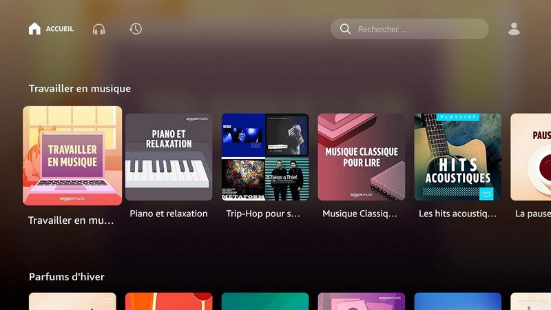 L’interface d’Amazon Music se compose d’une barre de boutons dans la partie supérieure et de bandeaux de recommandations dans le reste de l’écran.